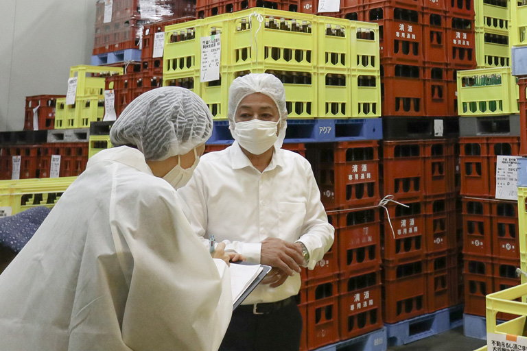 商品の運搬に欠かせないフォークリフト。鍋店の銘酒「仁勇」・「不動」のステッカーは、スタッフさんのお手製。職場への愛を感じました。見学中すれ違うたびたくさんのスタッフさんが声をかけてくださいました。活気ある会社です。