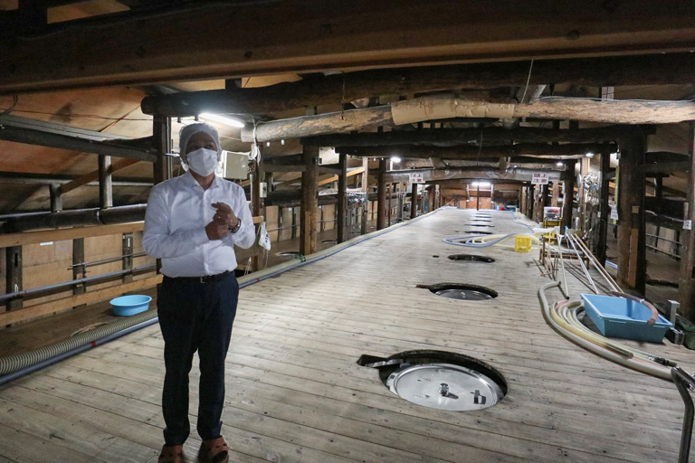 蔵へ入ると、仕込み用の大きなタンクが並び、2階の床にそのタンクの上蓋がはまる造りです。昔は、木を井桁状に組んだ足場が2階の床代わりだったそうですが、2000年に板張りになったこの床のおかげで、東日本大震災でもタンクに入ったお酒は無事でした。